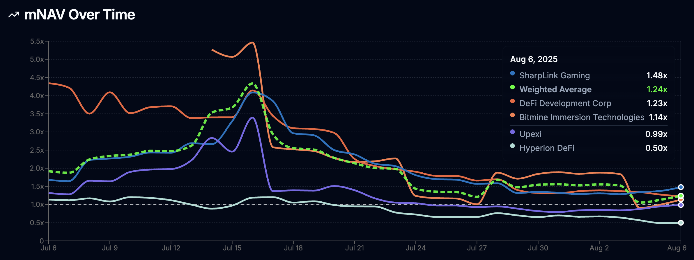 Over the past month, mNAVs have compressed across the board. Among the non-BTC treasury companies we track, the blended mNAV average (weighted by crypto holdings value) peaked at 4.3x on July 16, shortly after Bitmine began accumulating ETH. Since then, valuations have declined steadily, with the average now sitting at 1.2x and several companies trading at or below the value of their holdings.